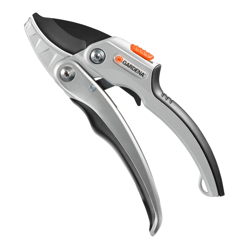 Gardena Comfort hefboomsnoeischaar SmartCut Bijzonder krachtige en comfortabele snoeischaar voor het licht en zeer ergonomisch knippen van dikkere takken en twijgen. De hefboomfunctie wordt afhankelijk van de akdikte ingesteld. Dikke takken kunnen zo licht en comfortabel door de hefboomoverbrenging „in drie fasen” worden geknipt. Precisiegeslepen bovenmes met antikleefcoating. Aluminium comfortgreep met softgrip. Eénhands-veiligheidsvergrendeling. Knip-Ø: max. 22 mm.