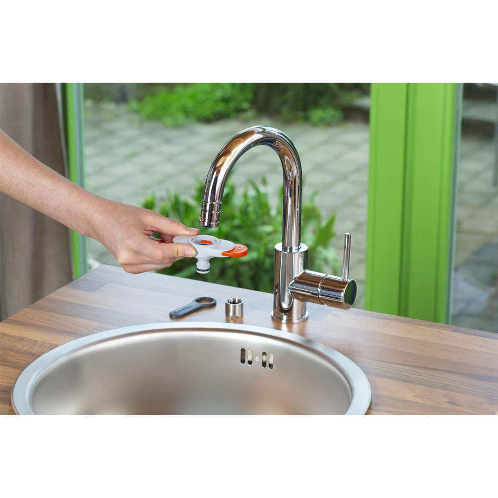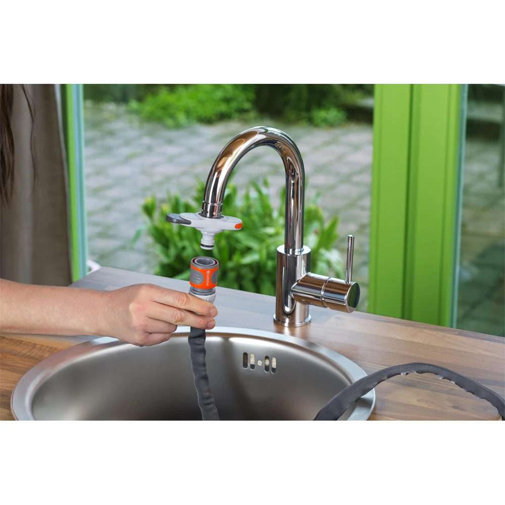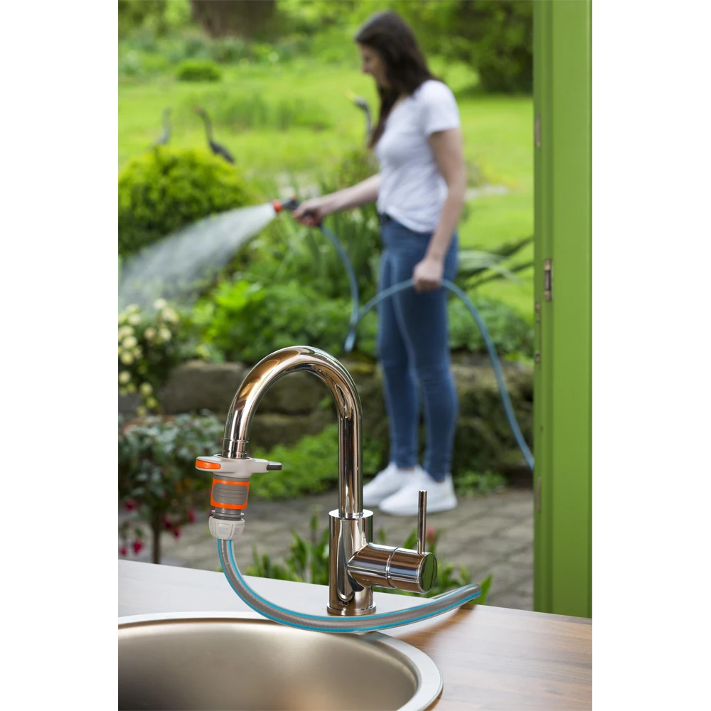 De kraanaansluiting voor binnenkranen van GARDENA maakt water geven op balkon en terras heel makkelijk. U hoeft niet meer met een gieter op en neer te lopen. De adapter aan de kraan bevestigen kan in slechts een paar eenvoudige stappen. Het aandraaien van de draad is kinderspel met de meegeleverde sleutel. Plaats vervolgens de adapter op het draad en druk op de schuifregelaar. Verschuif hem om de adapter aan het draad te bevestigen. Zodra dat is gebeurd, kan een slang worden bevestigd. Als u de schuifregelaar in de tegenovergestelde richting beweegt, wordt de adapter losgemaakt en kan deze gemakkelijk worden verwijderd. De adapter is compatibel met alle conventionele kranen met M 24 x 1 binnen- of M 22 x 1 buitendraad (niet geschikt voor niet onder druk staande of lage druk boilers). De kraanaansluiting is een essentieel accessoire voor binnenkranen voor grote hoeveelheden water, bijvoorbeeld om het aquarium of peuterbadje te vullen.