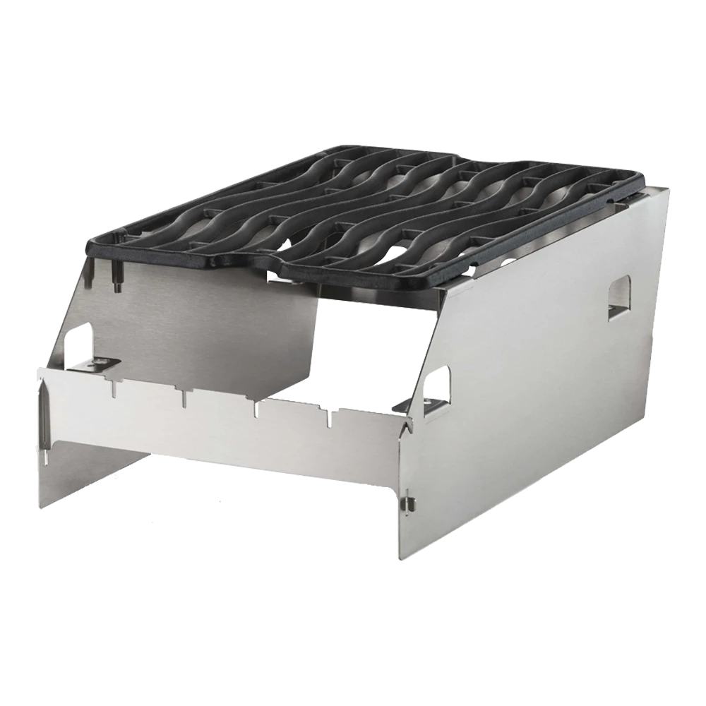 Multifunctioneel SIZZLE ZONE rek, te gebruiken als windscherm maar ook te gebruiken om het rooster op verschillende hoogtes in te stellen. Ontworpen met gleuven voor 6 shaschlik spiezen. Passend voor de RSE, Prestige en Prestige PRO modellen.