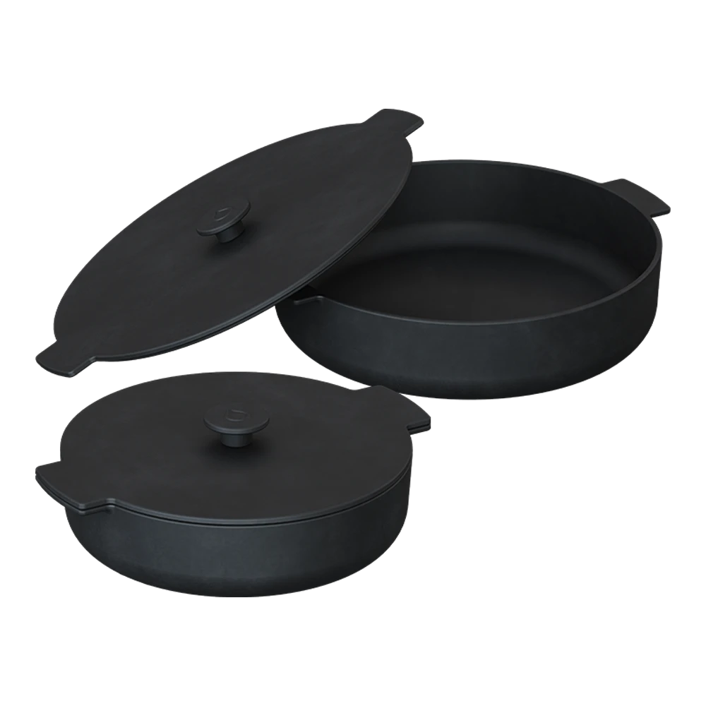 Deze set bestaat uit 2 strak vormgegeven gietijzeren pannen met diameters van 21 cm