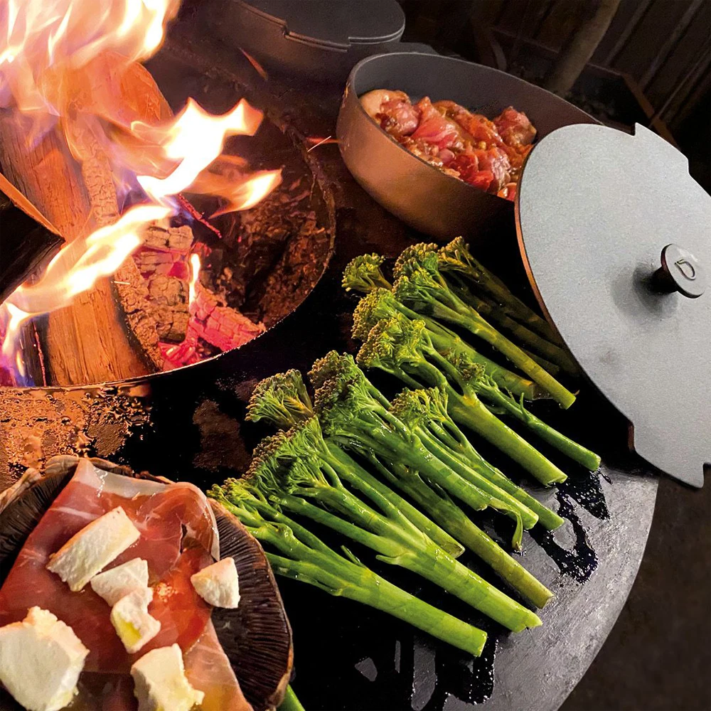 en 26 cm. De pannen zijn speciaal ontworpen om te gebruiken op de OFYR kookplaat en kenmerken zich door een perfecte warmteverdeling. Hierdoor kunnen de pannen gebruikt worden voor het koken van allerlei gerechten. Aangezien de knop van het deksel en de pan zelf heet kunnen worden, is het aangeraden om altijd handschoenen te gebruiken om de deksel te verwijderen of de pan op te tillen.