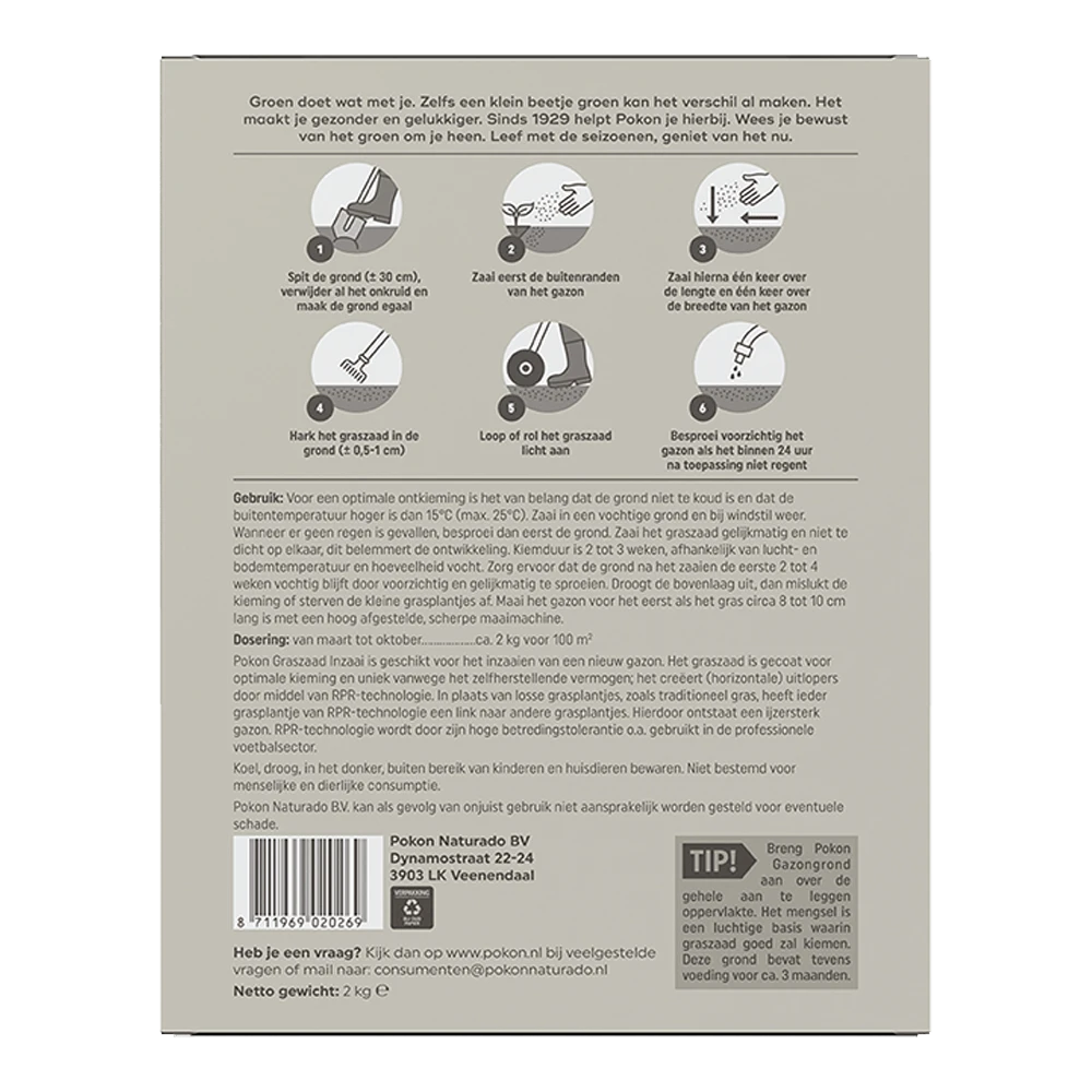 Pokon Graszaad Inzaai is geschikt voor het inzaaien van een nieuw gazon. Het graszaad is gecoat voor optimale kieming en uniek vanwege het zelfherstellende vermogen; het creëert (horizontale) uitlopers door middel van RPR-technologie. In plaats van losse grasplantjes, zoals traditioneel gras, heeft ieder grasplantje van RPR-technologie een link naar andere grasplantjes. Hierdoor ontstaat een ijzersterk gazon, RPR-technologie wordt door zijn betredingstolerantie o.a. gebruikt in de professionele voetbalsector. Voor een optimale ontkieming is het van belang dat de grond niet te koud is en dat de buitentemperatuur hoger is dan 15°C (max. 25°C). Zaai in een vochtige grond en bij windstil weer. Wanneer er geen regen is gevallen, besproei dan eerst de grond. Zaai het graszaad gelijkmatig en niet te dicht op elkaar, dit belemmert de ontwikkeling. Kiemduur is 2 tot 3 weken, afhankelijk van lucht- en bodemtemperatuur en hoeveelheid vocht. Zorg ervoor dat de grond na het zaaien de eerste 2 tot 4 weken vochtig blijft door voorzichtig en gelijkmatig te sproeien. Droogt de bovenlaag uit, dan mislukt de kieming of sterven de kleine grasplantjes af. Maai het gazon voor het eerst als het gras circa 8 tot 10 cm lang is met een hoog afgestelde, scherpe maaimachine.