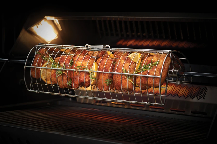 Een uniek ontworpen houder voor het bereiden van fijn voedsel als vis of groenten van het draaispit. Door de rotatie van het draaispit wordt het eten gelijkmatig verwarmd. Deze multifunctionele RVS houder is passend voor alle soorten draaispit.
